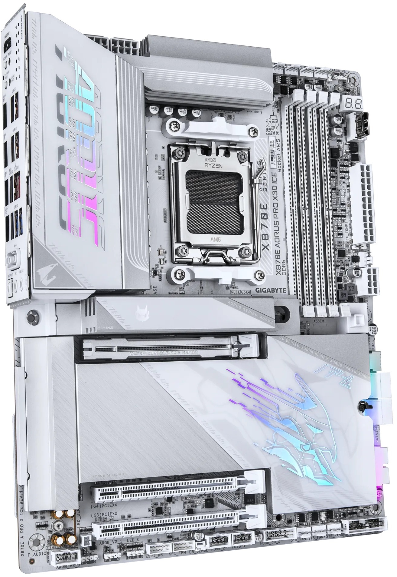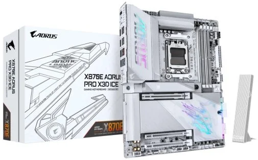Материнська плата Gigabyte X870E AORUS PRO X3D ICE — це високопродуктивне рішення на базі чіпсета AMD X870E із сокетом AM5, сумісне з процесорами AMD Ryzen 9000 / 8000 / 7000 серій. Виконана у форматі ATX, вона забезпечує надійність, швидкість та підтримку сучасних технологій для геймерів і ентузіастів.