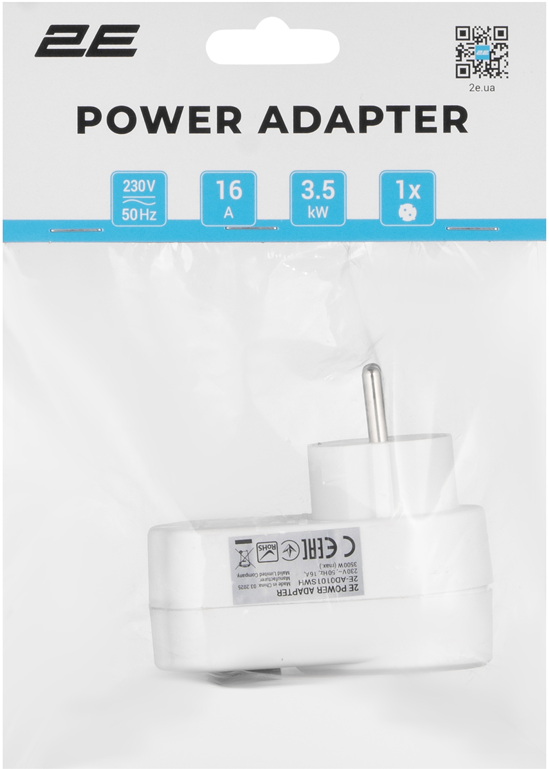 2E AD0101SWH - ідеальний для тих, хто шукає мінімалістичний адаптер з захистом, де одна розетка на 16 А поєднується з кнопкою вимкнення та компактністю, забезпечуючи стабільну роботу пристроїв у динамічному цифровому середовищі без зайвих витрат чи обмежень.