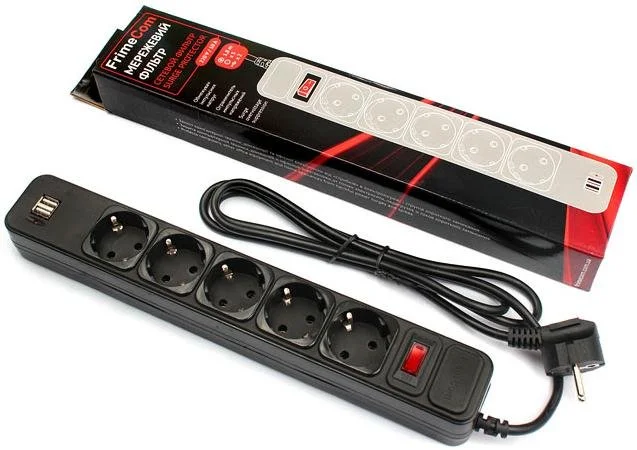 FrimeCom FC-BU4005W - мережевий фільтр із захистом від короткого замикання та перешкод. Оснащений двома USB портами, які призначені для зарядки мобільних пристроїв. Розеток всього 5-ть, вони дозволять підключати побутові пристрої чи цифрову техніку до мережі.