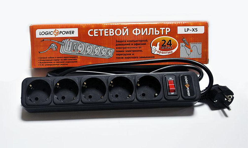Чудовий мережевий фільтр LogicPower LP-X5 виконаний із якісного пластику та забезпечує відмінні користувацькі характеристики. Оснащений кабелем довжиною 1.8 метра та п'ятьма євро-розетками із заземленням. Дозволяє підключити до однієї розетки до п'яти приладів, якщо їх сумарне навантаження не перевищує 220Вт. Корпус із вогнетривкого пластику є безпечним для використання як у офісі, так і вдома. Оснащено LogicPower LP-X5 захистом від короткого замикання та високочастотних імпульсних перешкод.