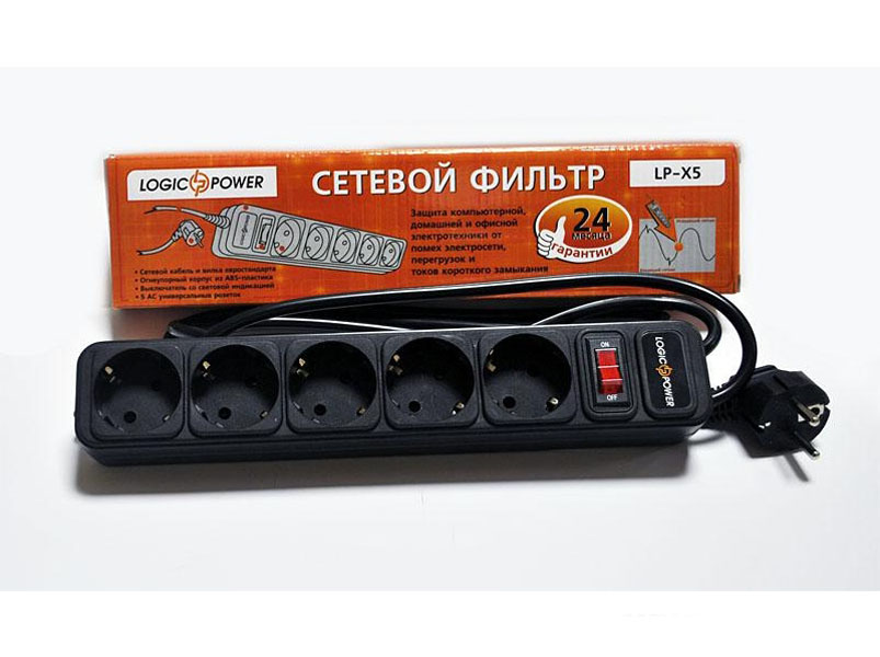 LogicPower LP-X5 - практичний мережевий фільтр. Дозволяє подовжити розетку на 4.5 метрів та підключити до неї до п'яти пристроїв загальним навантаженням 2200 ват. Виконаний подовжувач із добротного пластику та є стійким проти займання. Вимикач із світловою індикацією роботи додає зручності користування. LogicPower LP-X5 дозволяє підключати пристрої із EURO вилками. Також LogicPower LP-X5 захищає підключені до нього пристрої від високочастотних імпульсів.