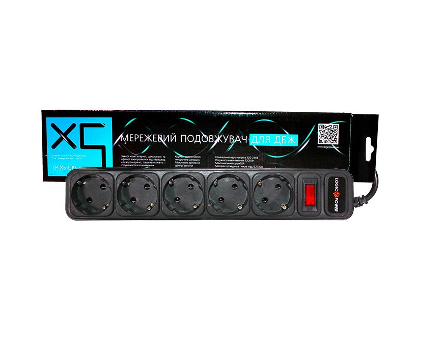 LogicPower LP-X5-UPS - п'ятиметровий мережевий фільтр який призначений для під'єднання до блоків безперебійного живлення. Виготовлений з міцного пластику та оснащений кнопкою ввімкнення. А довжини кабелю вистачить для зручного під'єднання багатьох пристроїв в межах потужності безперебійного блоку живлення.