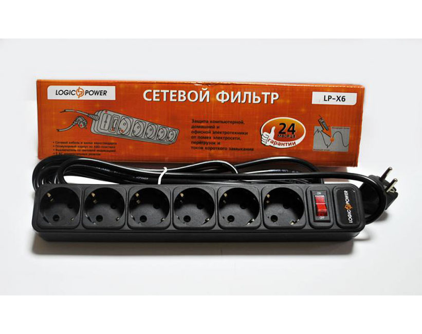 LogicPower LP-X6 - якісно зроблений мережевий фільтр. Наділений кабелем довжиною три метра та шістьма Euro розетками. Ідеальний вибір для використання як вдома, так і у офісі. Дозволяє підключити до однієї розетки до шести пристроїв, загальним навантаженням 2200 ват. Оснащений LogicPower LP-X6 мережевим вимикачем, із світловою індикацією роботи, захистом від короткого замикання та високочастотних імпульсних перешкод.