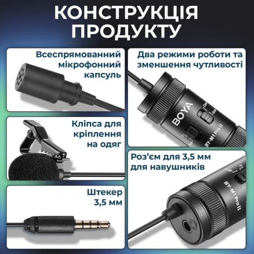BOYA BY-M1 Pro II поєднує зручність, універсальність і професійну якість звуку, роблячи його ідеальним вибором для створення відеоконтенту, онлайн-уроків, подкастів та будь-яких завдань, де важлива точна передача голосу.