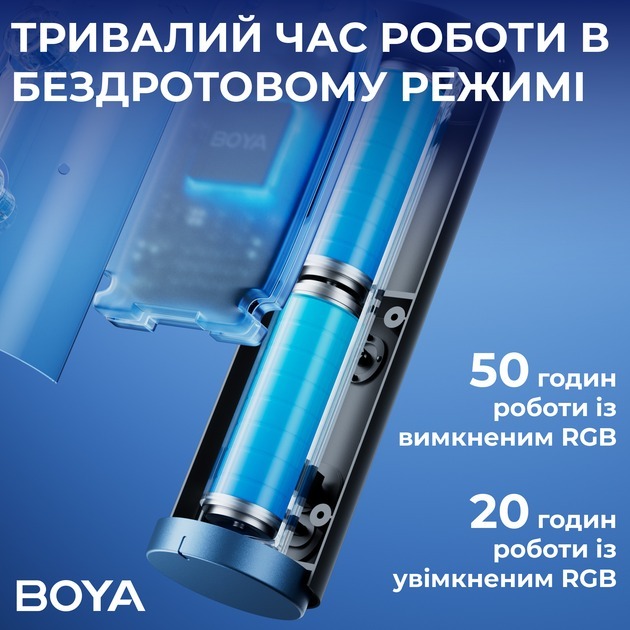 BOYA K5-02 RGB оснащений потужною батареєю: до 50 годин роботи у бездротовому режимі без підсвітки та 20 годин з увімкненими RGB-ефектами, а 11 налаштовуваних ефектів підсвітки (статичний, динамічний, градієнтне дихання) створюють атмосферу для стрімів, ігор та музичних сесій.