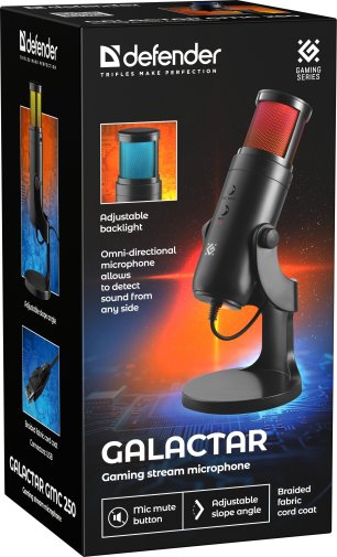 Defender Galactar GMC 250 — це універсальний ігровий та потоковий мікрофон, створений для стримерів, подкастерів і геймерів, яким важлива стабільна якість звучання та стильна подача. Завдяки регульованому RGB-підсвічуванню мікрофон легко вписується в будь-яку геймерську або студійну збірку, додаючи вашому робочому місцю яскравої атмосфери.