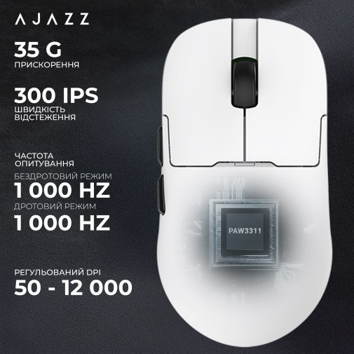 У серці миші — сенсор PixArt PAW3311 з максимальною чутливістю до 12000 DPI, яка легко регулюється під поточні завдання. Завдяки частоті опитування до 1000 Гц, максимальній швидкості 300 м/с і акселерації 35 G, AJ159P MC впевнено справляється навіть із динамічними іграми, гарантуючи точність і миттєвий відгук.