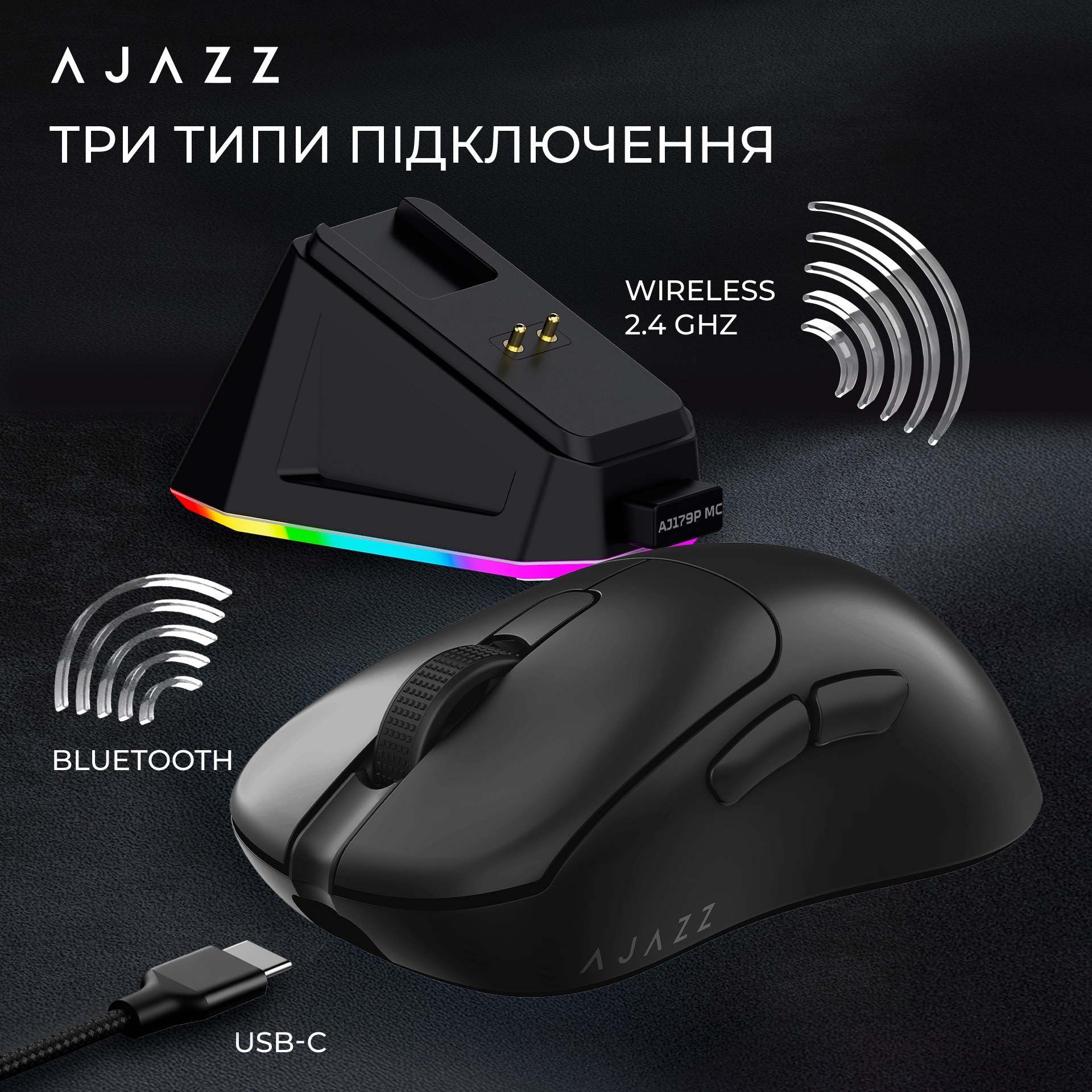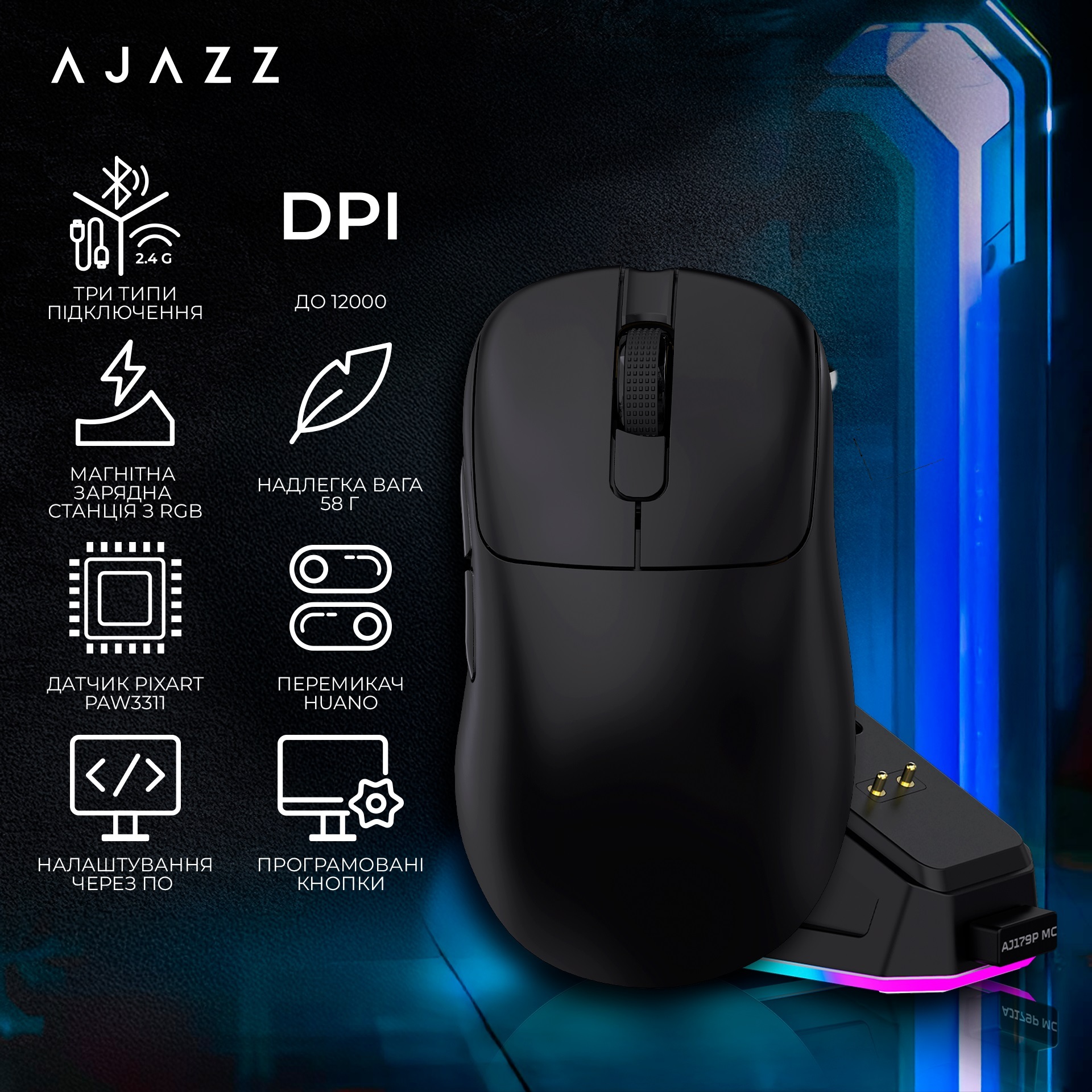 Ajazz AJ179P MC — це легка універсальна миша для геймінгу та роботи, яка поєднує точний сенсор, три режими підключення та сучасний дизайн для максимального комфорту та продуктивності