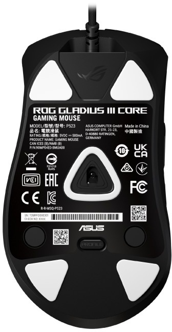 Конструкція Asus ROG Gladius III Core акцентує на мінімалізмі та довговічності: легкий корпус вагою 72 г з ергономічною асиметричною формою для правої руки оптимізує хват, з текстурованими боковими панелями для надійного зчеплення та 100% PTFE ніжками для плавного ковзання по поверхні. ROG Micro Switch II з ресурсом до 100 мільйонів кліків та Push-Fit Switch Sockets дозволяють легко замінювати механічні перемикачі без інструментів, подовжуючи термін служби та адаптуючи зусилля натискання під індивідуальні потреби, а гнучкий кабель ROG Paracord мінімізує опір для природних рухів. Aura Sync RGB з двома зонами (логотип та колесо прокрутки) додає візуальної динаміки, синхронізуючись з іншими ROG-пристроями для повного занурення, з компактними габаритами для зручного розміщення на столі чи в сумці.