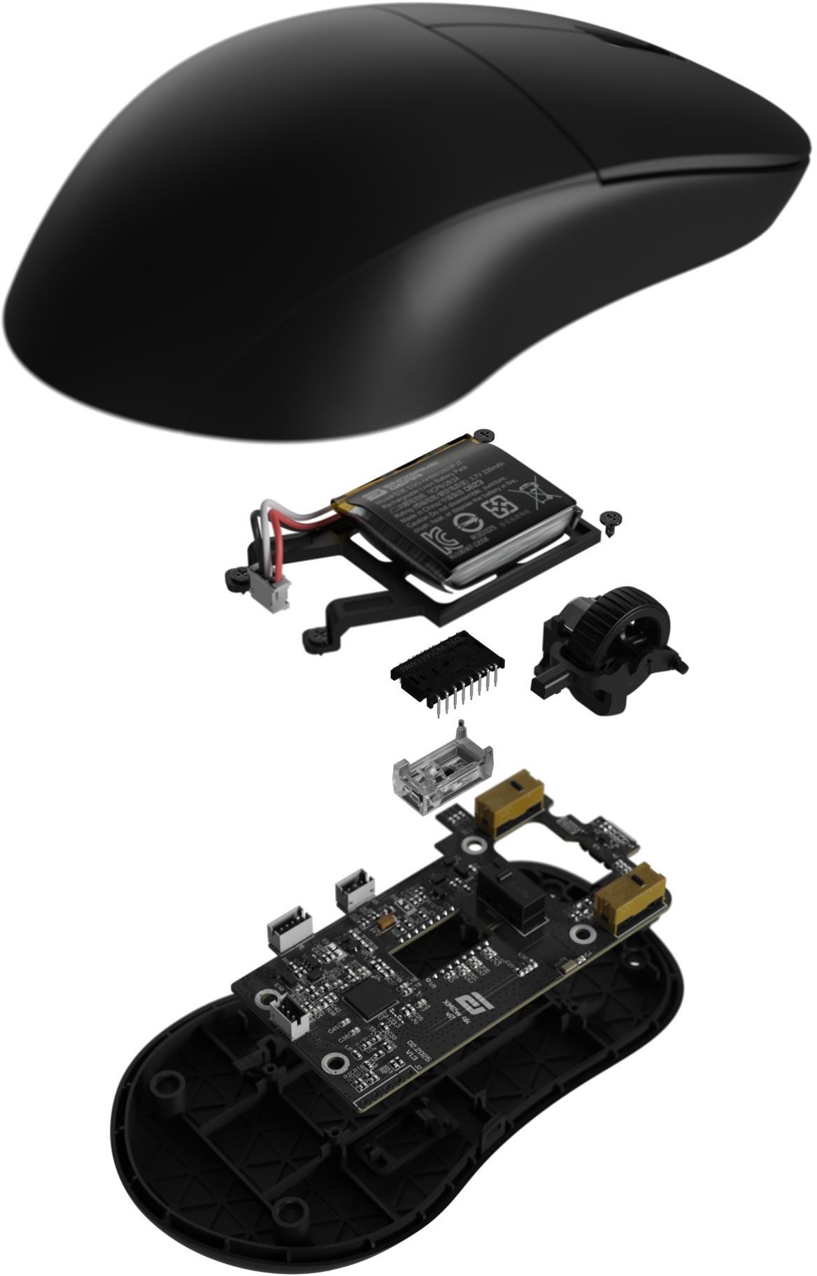 Форма корпусу оптимізована під claw grip та fingertip grip, а вага всього 63 г створює ідеальний баланс між легкістю та контролем під час інтенсивних сесій. Живлення забезпечує вбудований акумулятор із можливістю продовжити роботу в дротовому режимі без перерви на зарядку.