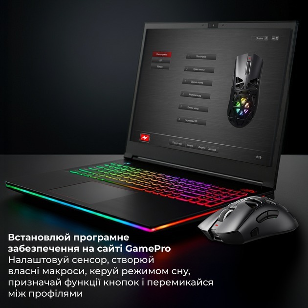 Через фірмове програмне забезпечення GamePro користувач може налаштовувати рівень DPI, створювати профілі, макроси та керувати RGB-підсвічуванням, підлаштовуючи мишу під свій стиль гри.