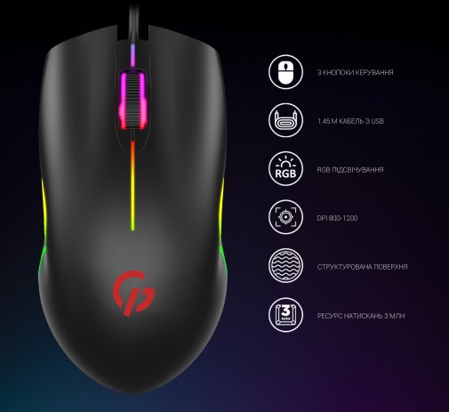 GM117 має оптичний датчик з чутливістю 1200 dpi, який забезпечить швидкий відгук миші, плавність в роботі й точність керування. Яскрава підсвітка створить або ж доповнить ігрову атмосферу в кімнаті.