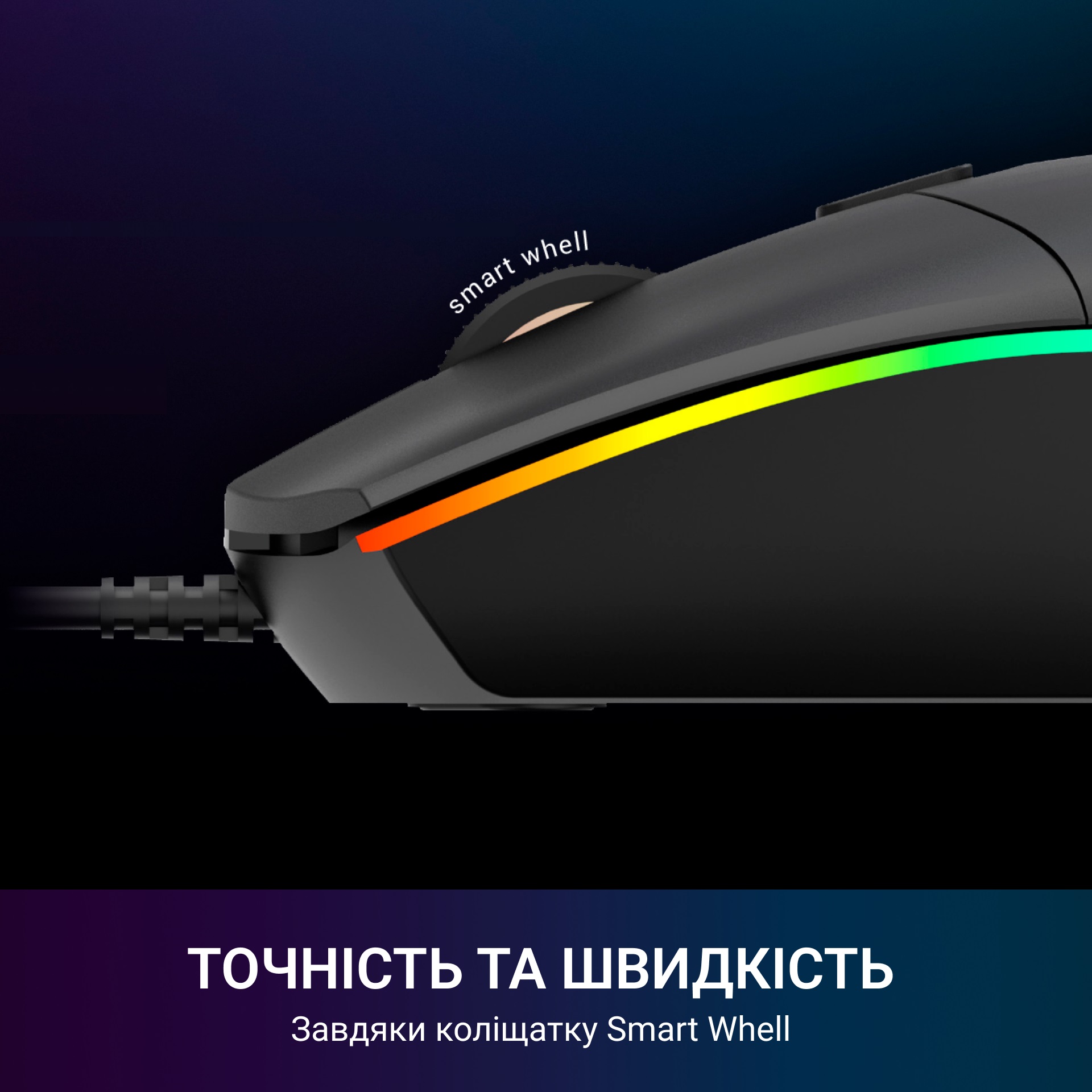 Пристрій легко під'єднується до ПК через USB. Оснащений надійним кабелем 1,5 м, якого вистачає для вільного переміщення миші.