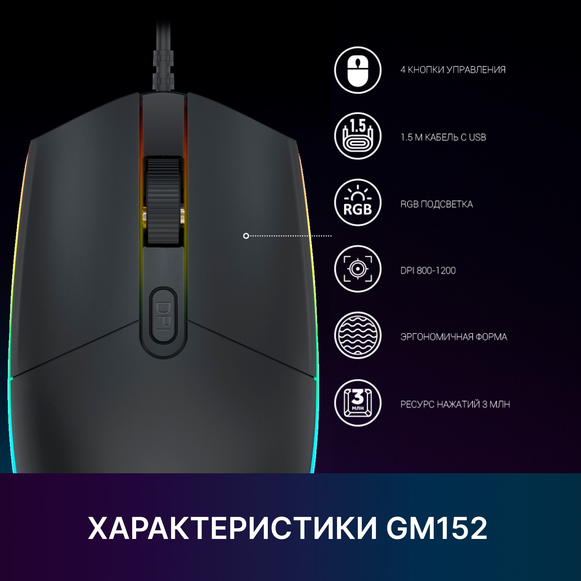 GamePro GM152 — ігрова дротова мишка, створена для захопливого геймінгу. Три режими регулювання роздільної здатності миші (800-1000-1200 dpi) дозволяють вільно перемикатися в грі за допомогою лише одного кліку.