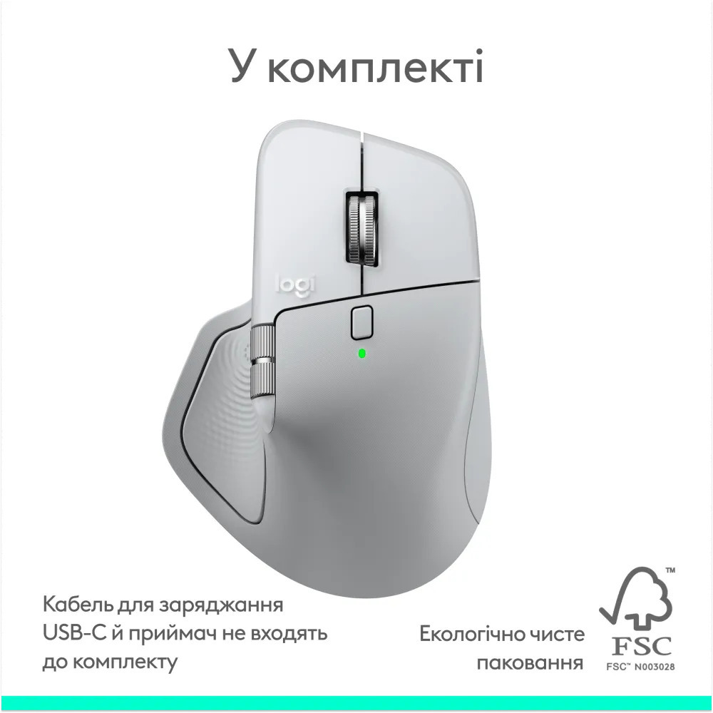 Корпус виготовлений з 54% переробленого постспоживчого пластику, колесо великого пальця — з низьковуглецевого алюмінію, а кобальт акумулятора — на 100% вторинний. Ергономічна форма для правої руки, вага 150 г і мікротекстурна поверхня зі стійкістю до забруднень забезпечують комфорт навіть під час тривалих робочих сесій.