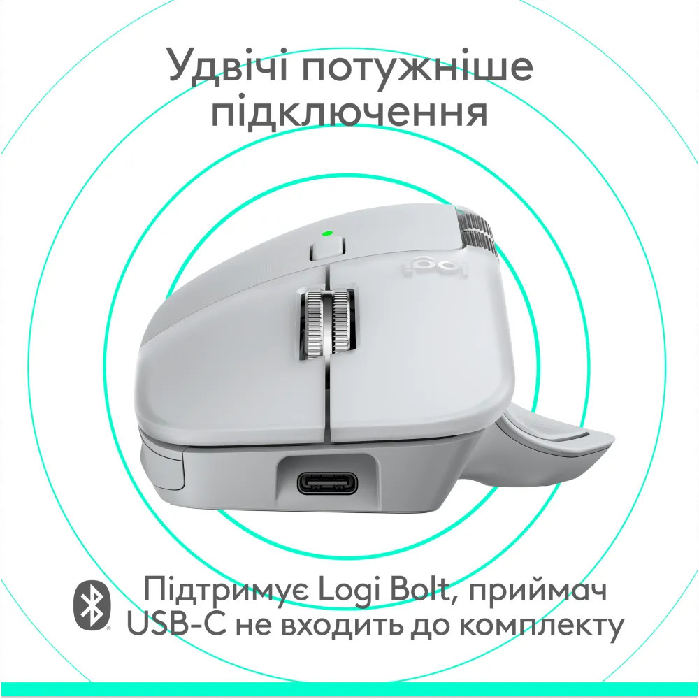 Підключення реалізовано через приймач Logi Bolt USB-C або Bluetooth Low Energy з підтримкою до трьох пристроїв одночасно. Перемикання між ними відбувається через Actions Ring або кнопку Easy-Switch. Кабель для заряджання USB-C і приймач Logi Bolt USB-C не входять до комплекту.