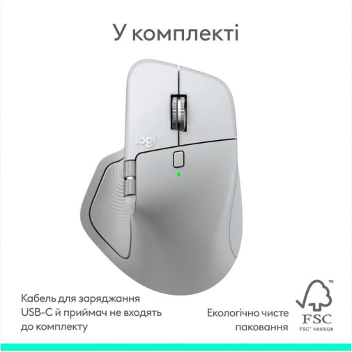 Завдяки технології Logitech Flow через Logi Options+ можна також безперешкодно переміщати файли між Mac та іншими комп'ютерами. Новий радіочип з оптимізованим розміщенням антени забезпечує вдвічі потужніший сигнал порівняно з MX Master 3S — що особливо важливо в умовах насиченого Wi-Fi-середовища. Автономність складає до 70 днів від одного заряду акумулятора місткістю 500 мАг; одна хвилина зарядки через USB-C повертає до 3 годин роботи, причому миша працює і під час заряджання. Технологія Quiet Click знижує рівень клацань на 90% — без жодних компромісів у тактильному відгуку.
