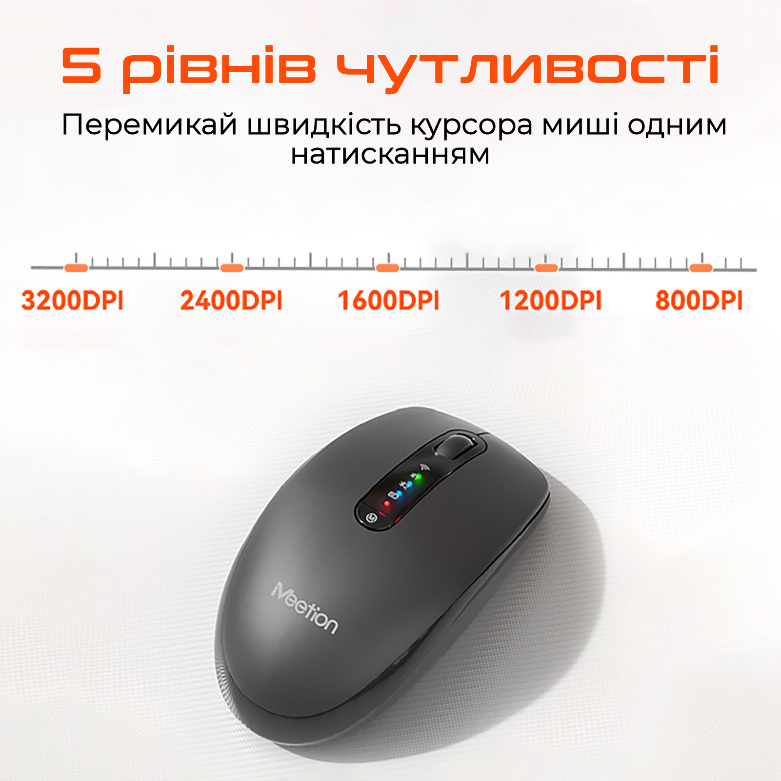 Оптичний сенсор з роздільною здатністю до 3200 DPI — достатньо для точної роботи в офісних програмах, браузері, редагуванні документів чи легких ігор. Кнопки перемикання DPI дозволяють швидко змінювати чутливість під різні завдання. Кліки майже безшумні: на 90% менше звуку при натисканні на клавіші та прокручуванні колеса.
