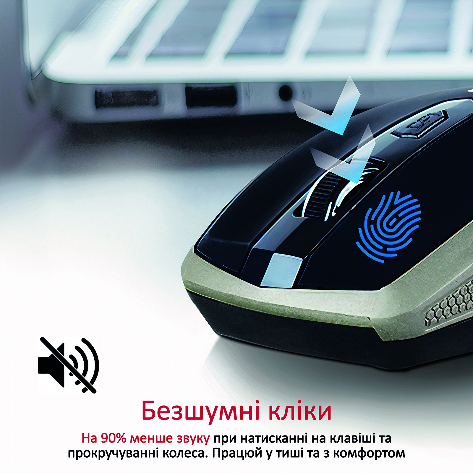 На 90% менше звуку при натисканні на клавіші та прокручуванні колеса. Працюй у тиші та з комфортом.