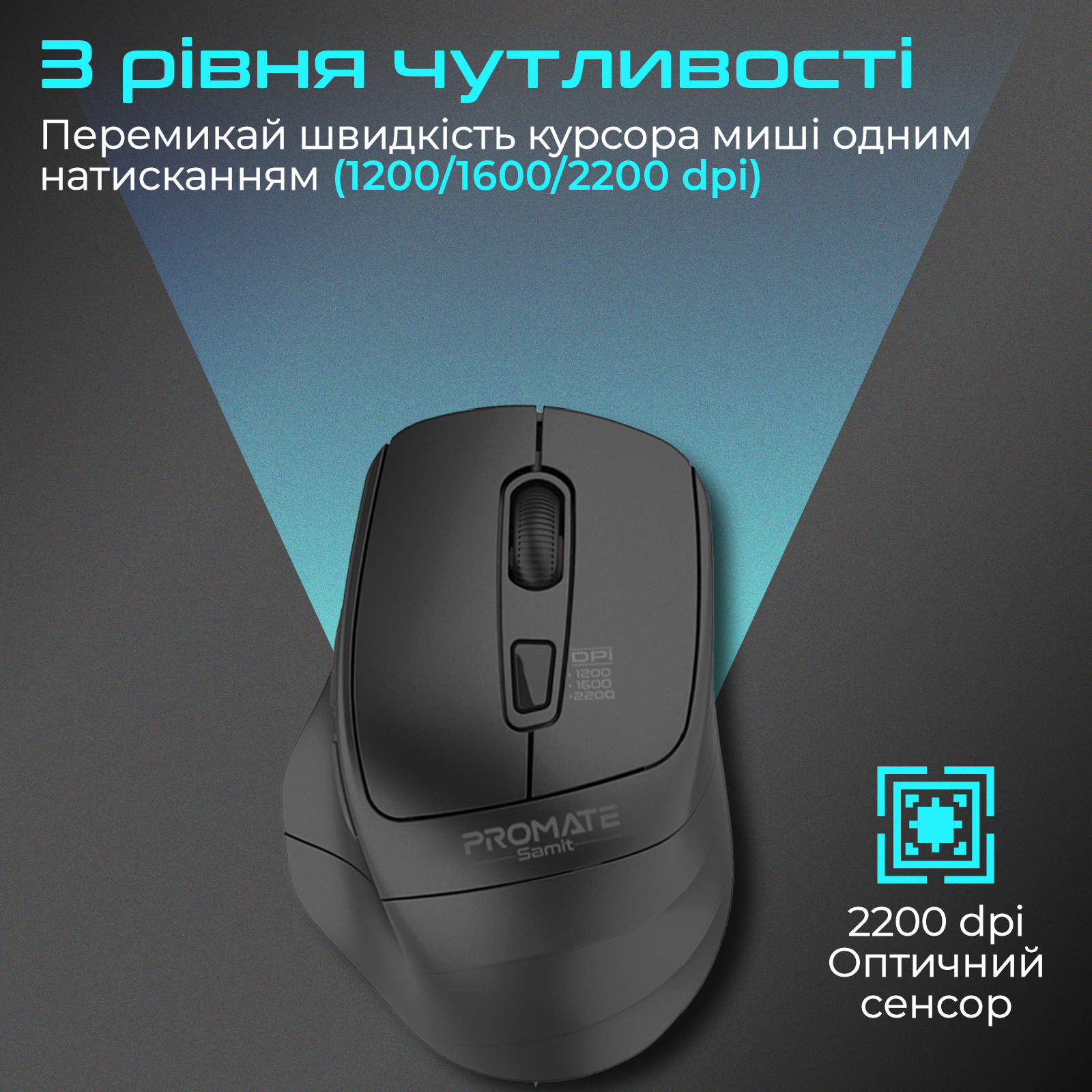 Перемикай швидкість курсора миші одним натисканням (1200/1600/2200 dpi).