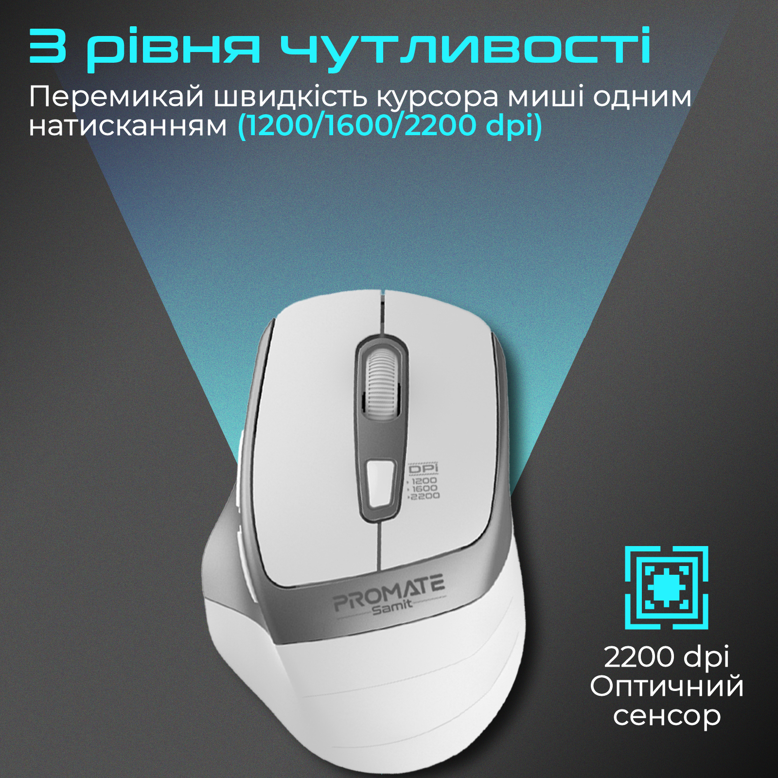 Перемикай швидкість курсора миші одним натисканням (1200/1600/2200 dpi).