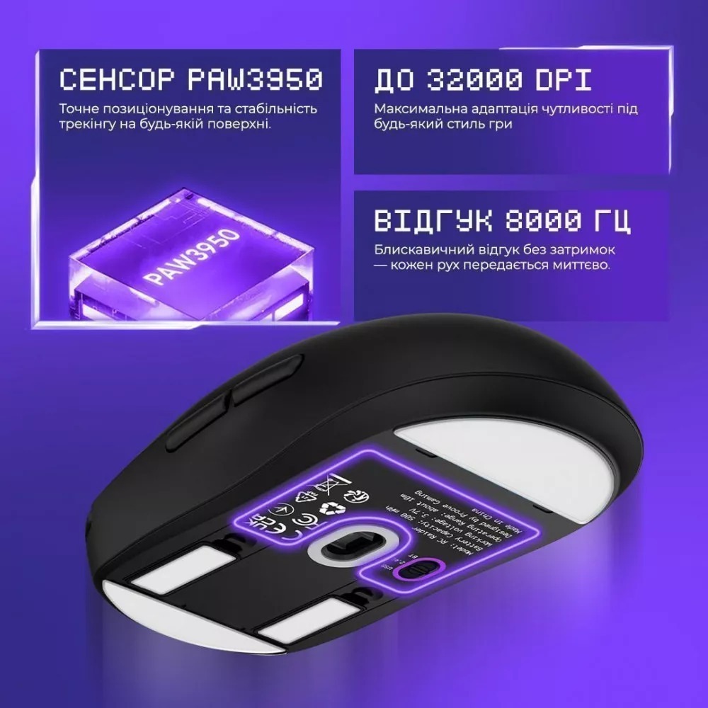 Усередині миші встановлено флагманський сенсор PAW3950, який підтримує чутливість від 800 до 32000 DPI та прискорення до 50G, що дозволяє миттєво реагувати навіть на найменші рухи. Це означає, що кожен ваш рух буде максимально точним — незалежно від стилю гри чи швидкості.