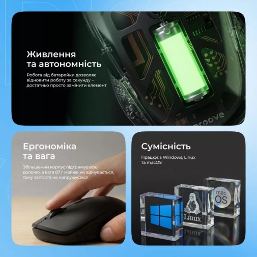 Мишка підтримує два режими бездротового зв'язку: Bluetooth і 2.4 ГГц через USB-приймач. Завдяки цьому її можна швидко підключити до різних пристроїв — ноутбука, планшета чи стаціонарного комп'ютера. Радіус дії до 10 метрів дає свободу пересування. Живлення — одна батарейка АА, яку легко замінити в будь-якому магазині. Мишка сумісна з Windows, Linux і macOS, тобто працюватиме з більшістю популярних пристроїв.