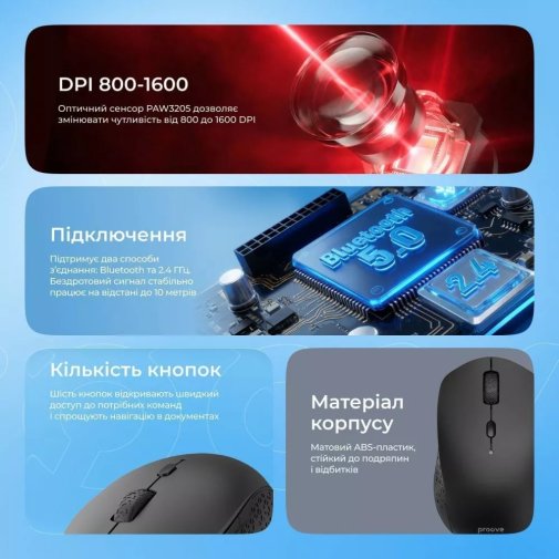 Модель має 6 кнопок, які охоплюють як стандартні дії, так і додаткові команди — наприклад, перемотування сторінок або перемикання між вкладками. Чутливість регулюється між трьома рівнями DPI: 800, 1200 і 1600. Це дозволяє підлаштувати точність курсора під конкретне завдання — від роботи з таблицями до перегляду вебсторінок. Датчик PAW 3205 забезпечує стабільне відстеження на більшості поверхонь.