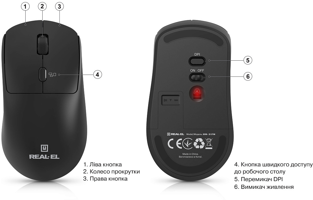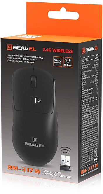 REAL-EL RM-317W — це надійна та практична бездротова мишка, яка ідеально підходить як для домашнього використання, так і для роботи в офісі. Завдяки продуманій конструкції та сучасним технологіям вона забезпечує комфорт і стабільність у повсякденній роботі з комп’ютером.