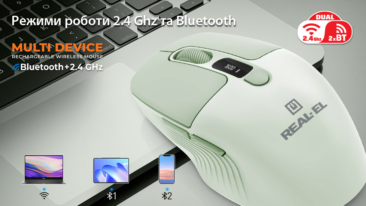 Бездротова оптична мишка REAL-EL RM-481W вирізняється елегантним дизайном у поєднанні з високою функціональністю, що робить її універсальним інструментом для повсякденної роботи, навчання чи розваг. Компактний корпус з матовим покриттям приємний на дотик і стійкий до подряпин, а симетрична форма підходить як для правої, так і для лівої руки. Інтегрований світлодіодний дисплей на верхній панелі інформує про рівень заряду батареї та поточну чутливість сенсора, дозволяючи миттєво адаптуватися до будь-яких умов використання без зайвих відволікань.