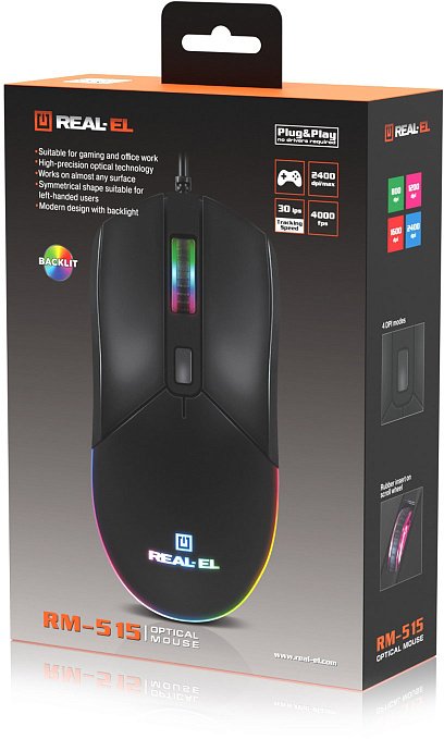 Real-EL RM-515 — дротова геймерська миша, яка забезпечить неймовірний досвід та зручність під час гри. Високоточна оптична технологія дозволяє ігровій комп'ютерній миші працювати практично на будь-якій поверхні.