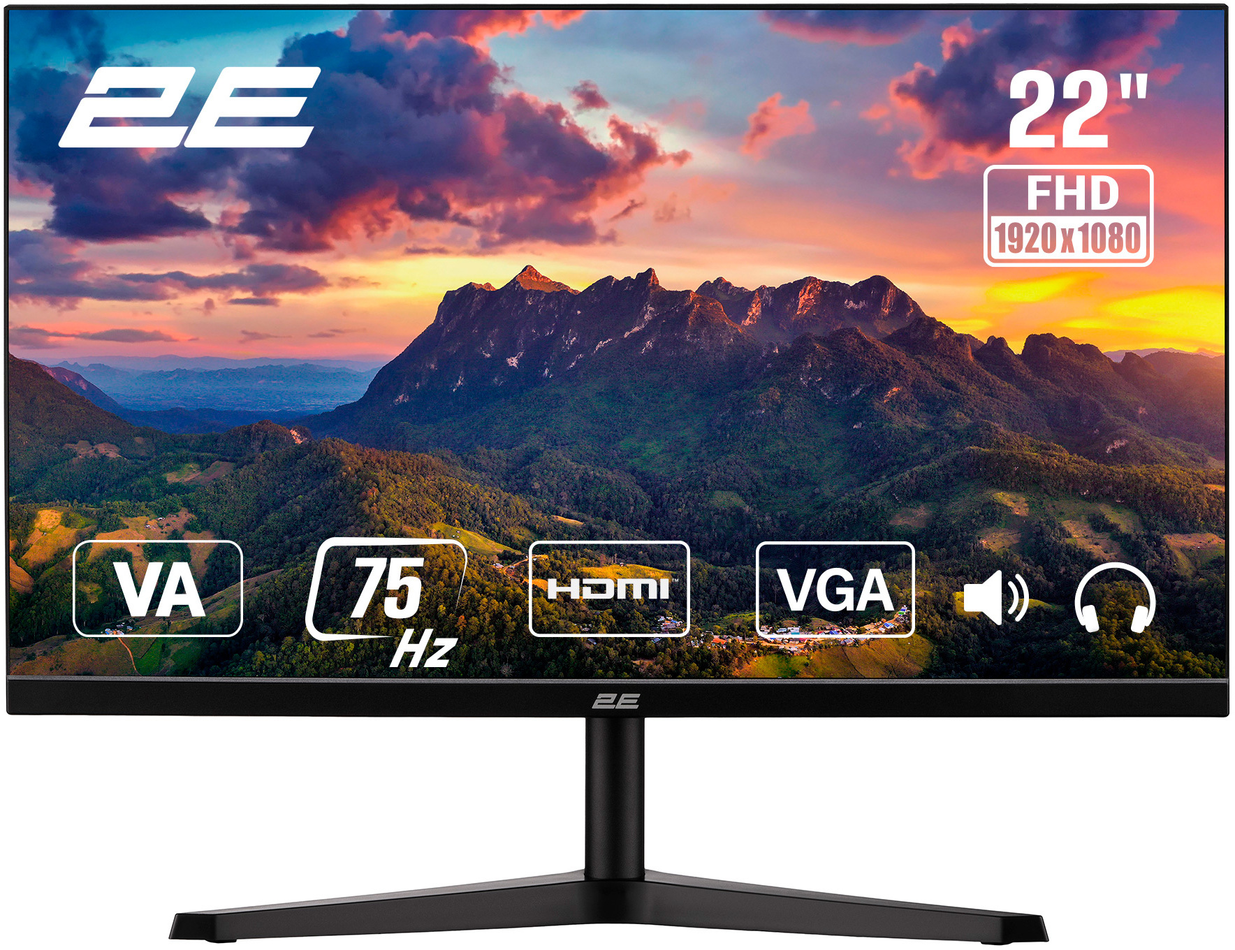 2E A2222B — класичний монітор з 21.5-дюймовою панеллю для роботи вдома чи в офісі. Він оснащений VA-матрицею з роздільною здатністю Full HD (1920x1080). Також ця модель має частоту оновлення 75 Гц, швидкість відгуку 6.5 мс, контрастність на рівні 3 000:1, а яскравість — 220 кд/м².