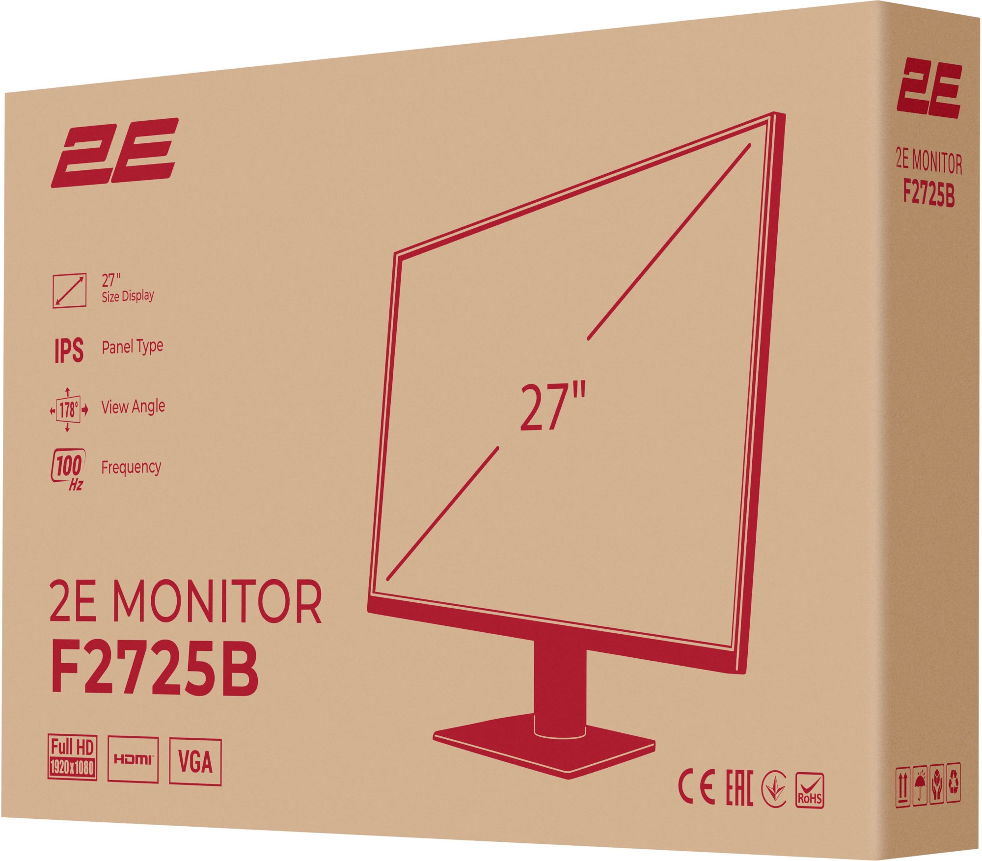 Монітор 2E F2725B також відзначається енергоефективністю: максимальне споживання становить до 36 Вт, а в режимі очікування — лише ≤0,5 Вт. Зовнішній блок живлення сприяє стабільній роботі та підвищує довговічність пристрою.