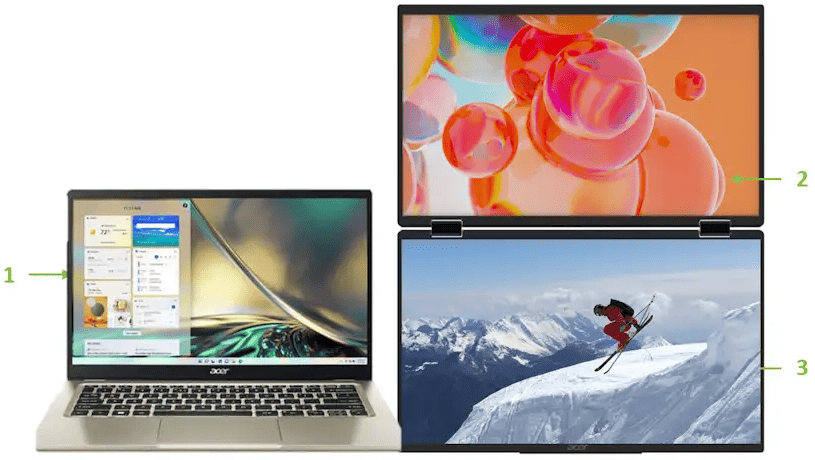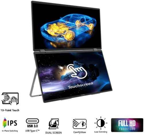 Завдяки складанню на 315° пристрій підтримує кілька режимів використання: класична вертикальна конфігурація з двома рівнями, режим «намету» для спільного перегляду контенту через стіл, горизонтальне розгортання в режим широкоформатного дисплея або складання однієї панелі назад — і тоді другий екран стає підставкою. VESA-кріплення 100х100 мм дозволяє також встановити монітор на стінний кронштейн або моніторну руку.
