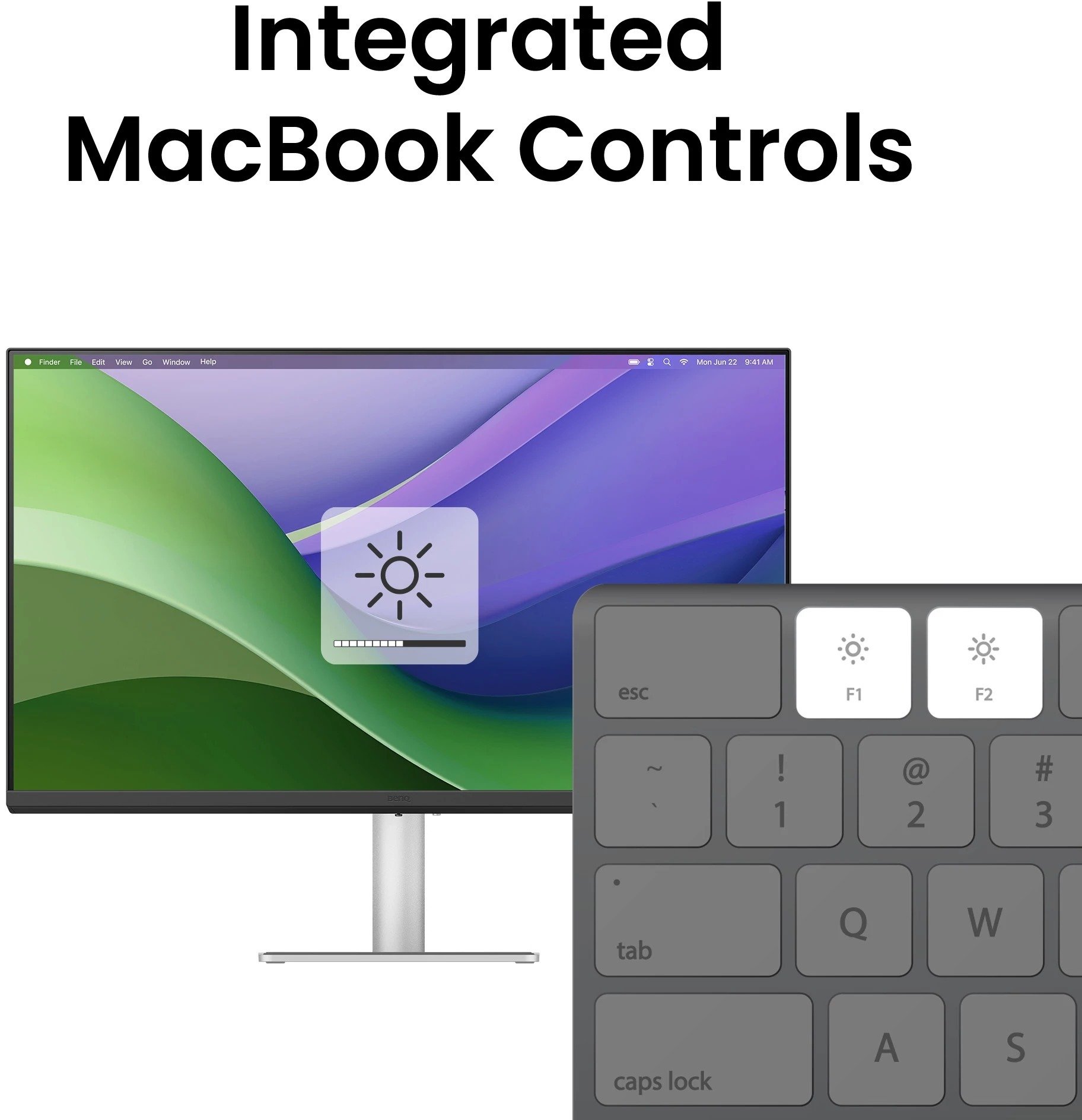 Особливою перевагою є синхронізація керування з MacBook: після встановлення безкоштовного програмного забезпечення Display Pilot 2 клавіші яскравості та гучності на клавіатурі MacBook одночасно регулюють обидва дисплеї — ноутбука і монітора. Вбудований датчик B.I.+ Gen2 автоматично коригує яскравість залежно від умов освітлення в кімнаті. Для захисту зору передбачені технологія Eye-Care від BenQ, фільтр синього світла з сертифікацією TÜV Rheinland та захист від мерехтіння.