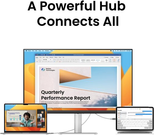 Підключення реалізовано через 2 порти HDMI та 2 порти USB-C: один з них забезпечує передачу відеосигналу з одночасним заряджанням MacBook на 90 Вт, другий — 15 Вт для заряджання iPad або iPhone. Також є 2 порти USB-A 3.2 Gen 1 для підключення периферії, що перетворює монітор на повноцінний хаб робочого столу. Функція Always-on Power Charging дозволяє заряджати пристрої, навіть коли монітор вимкнений. Вбудовані стереодинаміки доповнюють аудіодосвід без потреби в зовнішніх колонках.