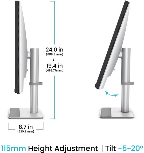Ергономічна підставка підтримує регулювання висоти на 115 мм, нахил від -15° до +20°, поворот на ±15° та розворот на 90° (pivot) в обидва боки для роботи в портретному режимі. Монітор сумісний з кріпленням VESA, що дозволяє використовувати кронштейн для монітора. Корпус виконаний у мінімалістичному сірому дизайні, який гармонійно вписується в екосистему Apple.