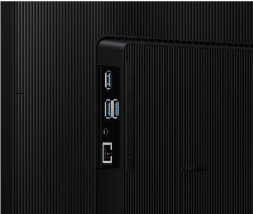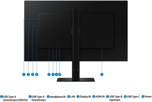 Samsung LS27D804UAIXUA оснащений портом USB-C, який дозволяє одночасно передавати дані та заряджати пристрої потужністю до 90 Вт, а також вбудованим портом LAN для прямого підключення до мережі без додаткових адаптерів. Вбудований KVM-перемикач дає змогу підключати до монітора два джерела одночасно та керувати ними однією клавіатурою і мишею, обираючи режими розділеного екрана, «Картинка у картинці» або «Картинка за картинкою». Це забезпечує ефективну багатозадачність та спрощує роботу з кількома пристроями.