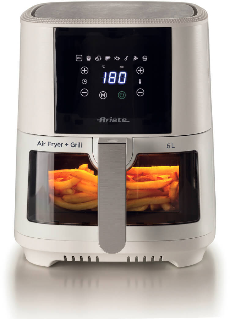 Мультипіч Ariete 4626 — це сучасна аерофритюрниця, яка дозволяє готувати улюблені смажені страви значно корисніше, використовуючи всього одну ложку олії або взагалі без неї. Завдяки великому знімному кошику об’ємом 6 літрів пристрій ідеально підходить для сімейних обідів, адже за один цикл можна приготувати до 2,5 кг картоплі фрі, а також м’ясо, рибу, крокети, овочі чи паніровані страви — як заморожені, так і свіжі.