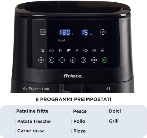 Ariete 4633 — це багатофункціональне рішення для приготування хрустких і смачних страв: від картоплі фрі та панірованих закусок до риби, овочів і солодких рецептів. Вона поєднує здоровий підхід до смаження, простоту догляду та зручне керування, роблячи щоденне приготування їжі швидким і комфортним.