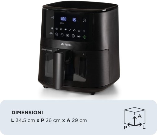 Мультипіч Ariete 4633 — це компактна та функціональна аерофритюрниця, яка дозволяє готувати улюблені смажені страви корисніше, використовуючи лише одну столову ложку олії або взагалі без неї. Завдяки кошику об’ємом 4 літри прилад легко справляється з приготуванням великих порцій: за один раз можна приготувати до 1,5 кг картоплі фрі, а також крокети, рибу, м’ясо, овочі та різноманітні паніровані страви — як заморожені, так і свіжі.