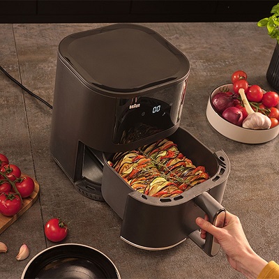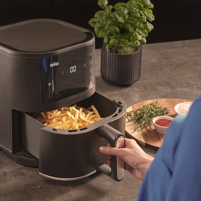 Компактний дизайн підходить навіть для невеликих кухонь, при цьому об'єм у 4.3 л дозволяє готувати великі порції до 1.2 кг курки, чи до 1 кг замороженої картоплі фрі.