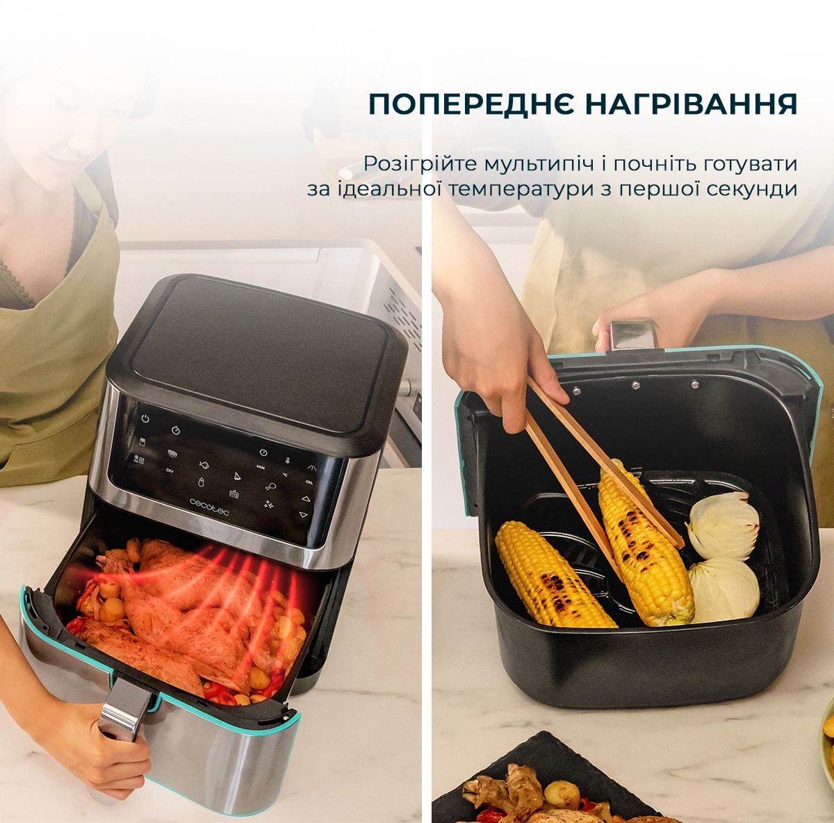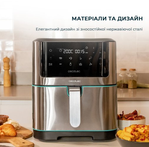 Розігрійте мультипіч і почніть готувати за ідеальної температури з першої секунди, для досягнення ідеальної соковитості Ваших страв. Високоякісні матеріали Мультипіч CECOTEC Cecofry Supreme має гарний дизайн з обробкою з нержавіючої сталі, що підвищує стійкість та довговічність у тривалому використанні.