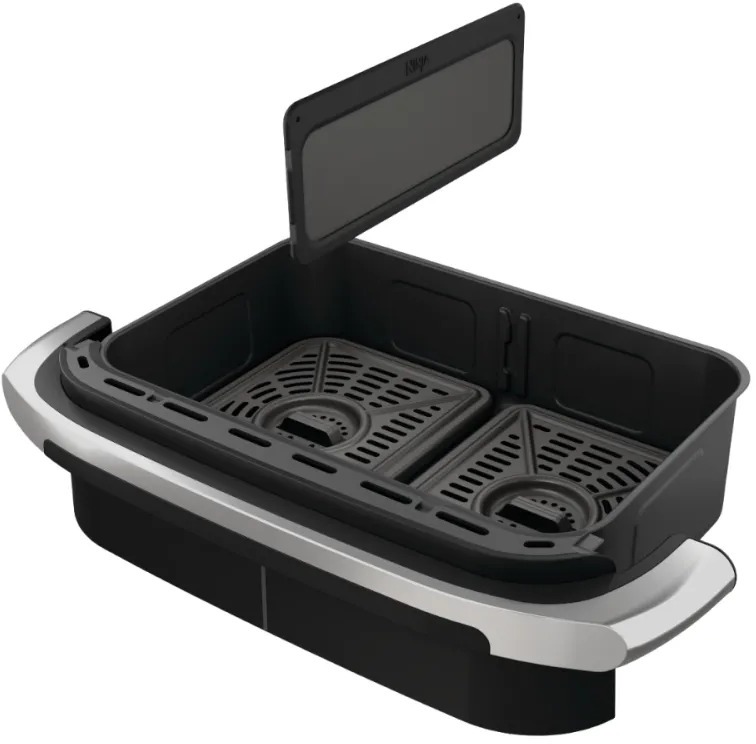 Конструкція включає два піддони, антипригарну чашу MegaZone, роздільник та тарілки, які легко мити вручну або в посудомийній машині. Інтуїтивний контроль і антипригарне покриття забезпечують комфортне приготування та чистку без зайвих зусиль. У комплекті йде книга рецептів від шефа, що надихає на гастрономічні експерименти: від крокетів із сиром до фруктових чіпсів.