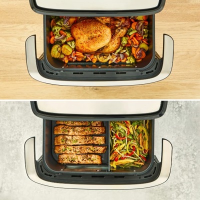 У режимі GiantZone на 9 л ви зможете приготувати запіканки, велику порцію картоплі фрі або навіть дві цілі курки одночасно — об’єму вистачить на всіх. А коли потрібно приготувати різні страви паралельно, працюють дві окремі нагрівальні зони, які легко синхронізуються, щоб усе було готове одночасно. Роздільник FlexCook встановлюється та знімається буквально одним кліком, а сам його можна мити в посудомийній машині.