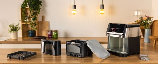 Мультипіч має дві позиції приготування, щоб максимально розкрити смак страв: нижня позиція ідеальна для великої кількості м’яса та овочів, тоді як верхня підійде для невеликих інгредієнтів, таких як тости або філе лосося. Чаша об’ємом 7 л дозволяє приготувати до 1,4 кг картоплі фрі, 6 печива або 5 філе лосося — при цьому на 51 % швидше, ніж у традиційній духовці, без попереднього нагріву.