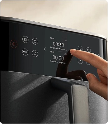 Синхронне або роздільне приготування робить процес ще більш зручним: можна одночасно готувати однакові страви в обох кошиках, або використовувати функцію SYNC для встановлення різних параметрів для кожного кошика, щоб основна страва та гарнір були готові одночасно. 14 попередньо встановлених режимів дозволяють легко готувати картоплю фрі, стейки, овочі, курячі ніжки, торти, піцу чи сушені фрукти. Ручний режим та широкий температурний діапазон від 40 до 230°C дають можливість витримувати тісто, сушити фрукти, готувати хрустку картоплю або доводити стейки до бажаної прожарки.