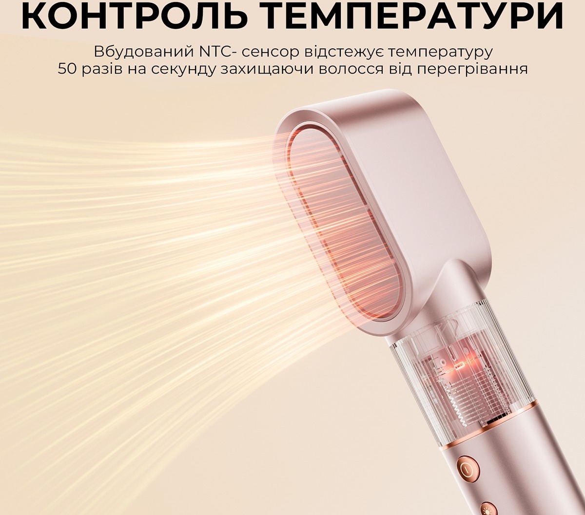Щоб волосся не пересушувалося, пристрій оснащений NTC-регулятором температури, який вимірює її 50 разів на секунду та автоматично коригує нагрів. Це дозволяє уникнути перегрівання й забезпечує делікатний догляд навіть за ослабленим волоссям. Додатковий захист забезпечує технологія негативних іонів — понад 20 мільйонів іонів нейтралізують статичну електрику, знімають пухнастість і роблять волосся гладким і блискучим без додаткових засобів.