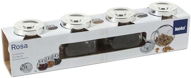 Навіщо ж плодити в кухонних шафках одноразові пакетики та коробочки, якщо можна один раз і надовго купити спеціальні ємності для зберігання? Особливо, коли вони продаються набором і за приємною ціною. Мова йде про набір ємностей для зберігання сипучих KELA Rosa від провідного німецького виробника посуду і кухонного начиння - компанії KELA. Набір складається з чотирьох однакових баночок об'ємом 200 мл. кожна. Виготовлені вони з безбарвного прозорого скла та укомплектовані кришками з безпечного харчового пластику. Форма баночок дозволяє ставити їх не тільки вертикально, а ще й під кутом 45 градусів.