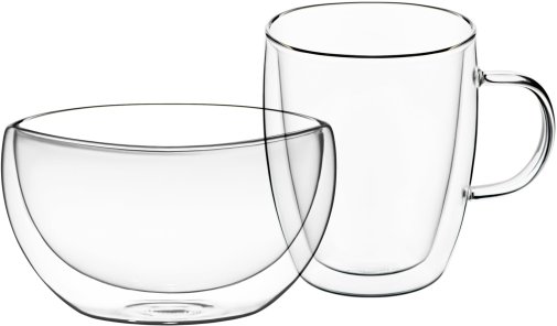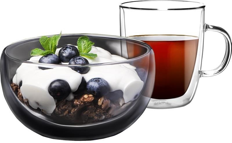 Чашка 270 мл та піала 500 мл з подвійними стінками. Виготовлені з термостійкого боросилікатного скла. Підходять для щоденного використання.
